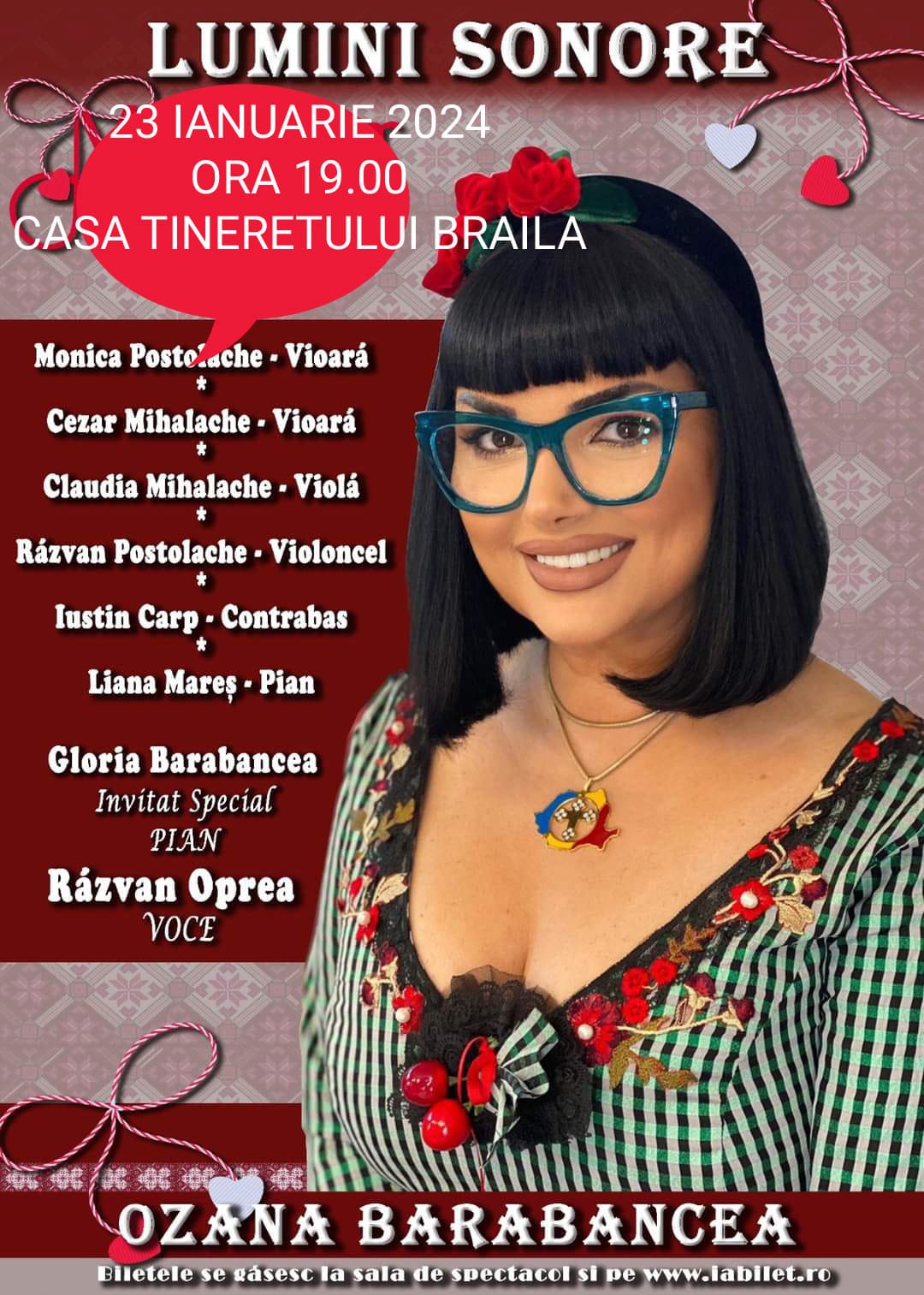 Marți, 23 ianuarie, de la ora 19.00, la Casa Tineretului din Brăila va avea loc Concertul ”Lumini Sonore Sextet by Ozana Barabancea ”.
