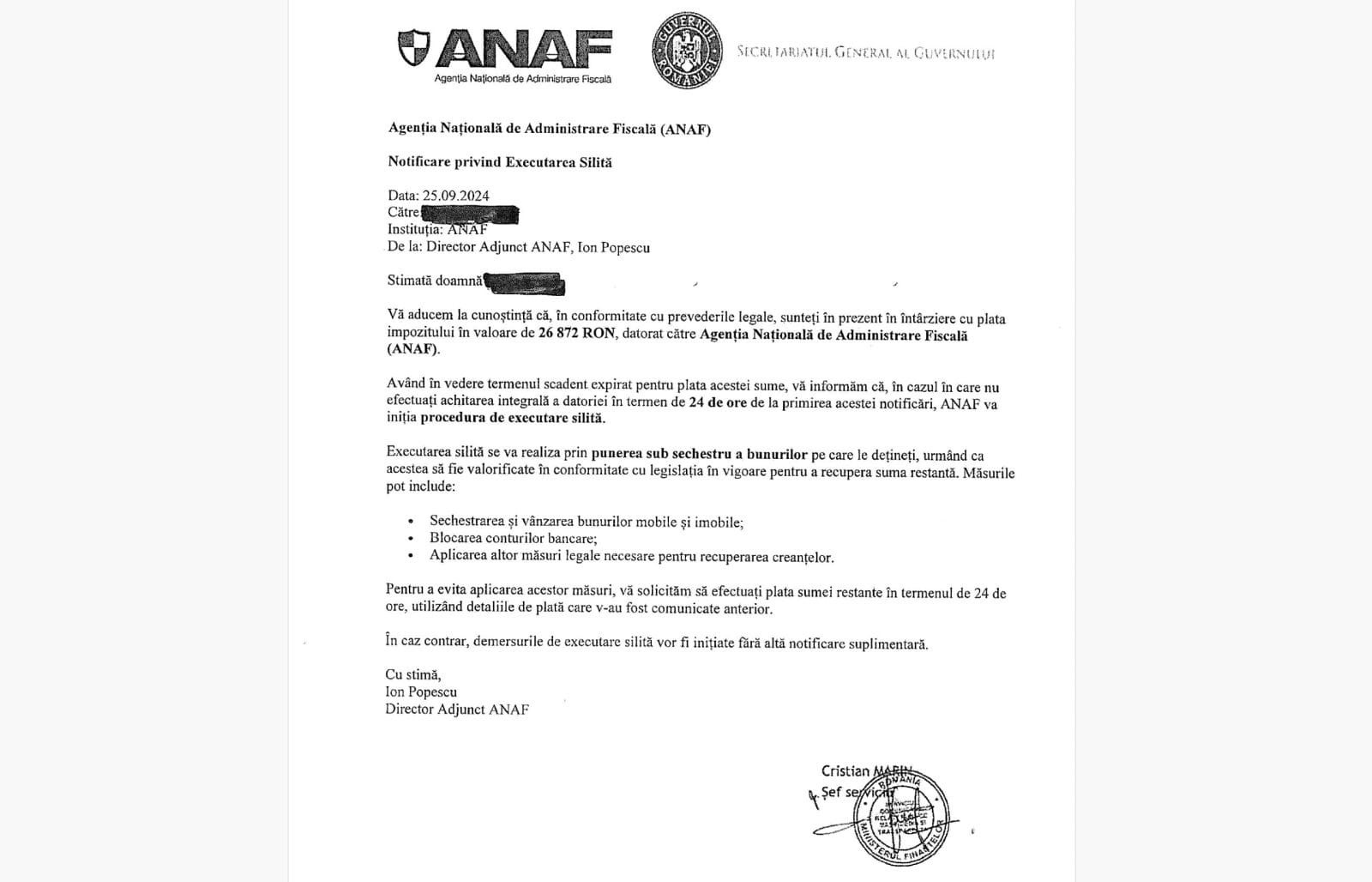 O nouă campanie de emailuri false, transmise în numele ANAF, este în desfășurare în această perioadă. Contribuabililor, persoane fizice, le este transmisă o „Nota informativă” prin care sunt înștiințați cu privire la o presupusă datorie, pentru care este necesară plata pentru evitarea executării silite și a valorificării bunurilor.