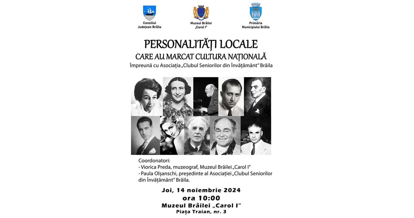 Mâine, 14 noiembrie, începând cu ora 10:00, la Muzeul Brăilei „Carol I” se va desfășura activitatea „Personalități locale care au marcat cultura națională”.