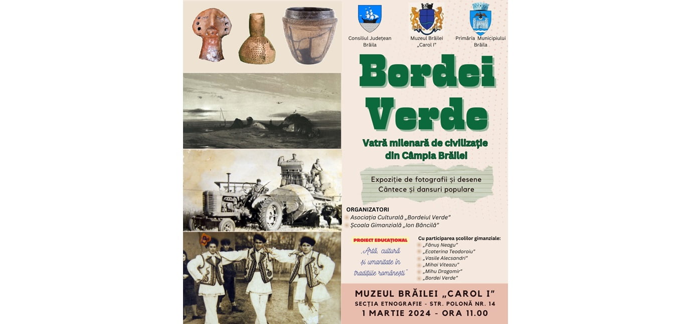 Secția Etnografie a Muzeului Brăilei „Carol I” (strada Polonă, nr. 14), va găzdui mâine, 1 martie, la ora 11.00, vernisajul expoziție fotodocumentară „Bordei Verde – Vatră milenară de civilizație din Câmpia Bărăganului”Organizatorii expoziției sunt Asociația Culturală „Bordeiul Verde” și Școala Gimnazială „Ion Băncilă”, în parteneriat cu Muzeul Brăilei. „De Mărțișor mergem să prezentăm comunitatea noastră «la oraș», la Brăila! În cadrul unui proiect educațional comun – »Artă, cultură și umanitate în tradițiile românești», derulat împreună cu mai multe școli din orașul Brăila, Asociația Culturală „Bordeiul Verde” va prezenta aspecte din istoria și tradițiile comunității noastre, în cadrul unei expoziții fotodocumentare. Totodată, elevii de la școlile participante, inclusiv de la Școala Gimnazială Bordei Verde, vor prezenta un set de desene despre lumea satului, văzută prin ochii lor. Invitația este deschisă pentru toți cei care doresc să asiste la evenimentul de pe 1 martie, cât și să viziteze expoziția, care va rămâne deschisă și în săptămânile următoare”, se arată într-un comunicat dat publicității.
