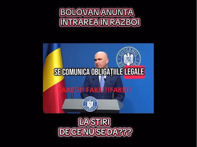 „Atenţie! Semnalăm existenţa unei campanii de răspândire a unor informaţii false, prin care sunt prezentate ca fiind veritabile clipuri false, realizate cu ajutorul programelor de inteligenţă artificială, din care reiese că prim-ministrul Ilie Bolojan anunţă intrarea României în război, începând cu luna septembrie 2025”, a anunţat MAI.