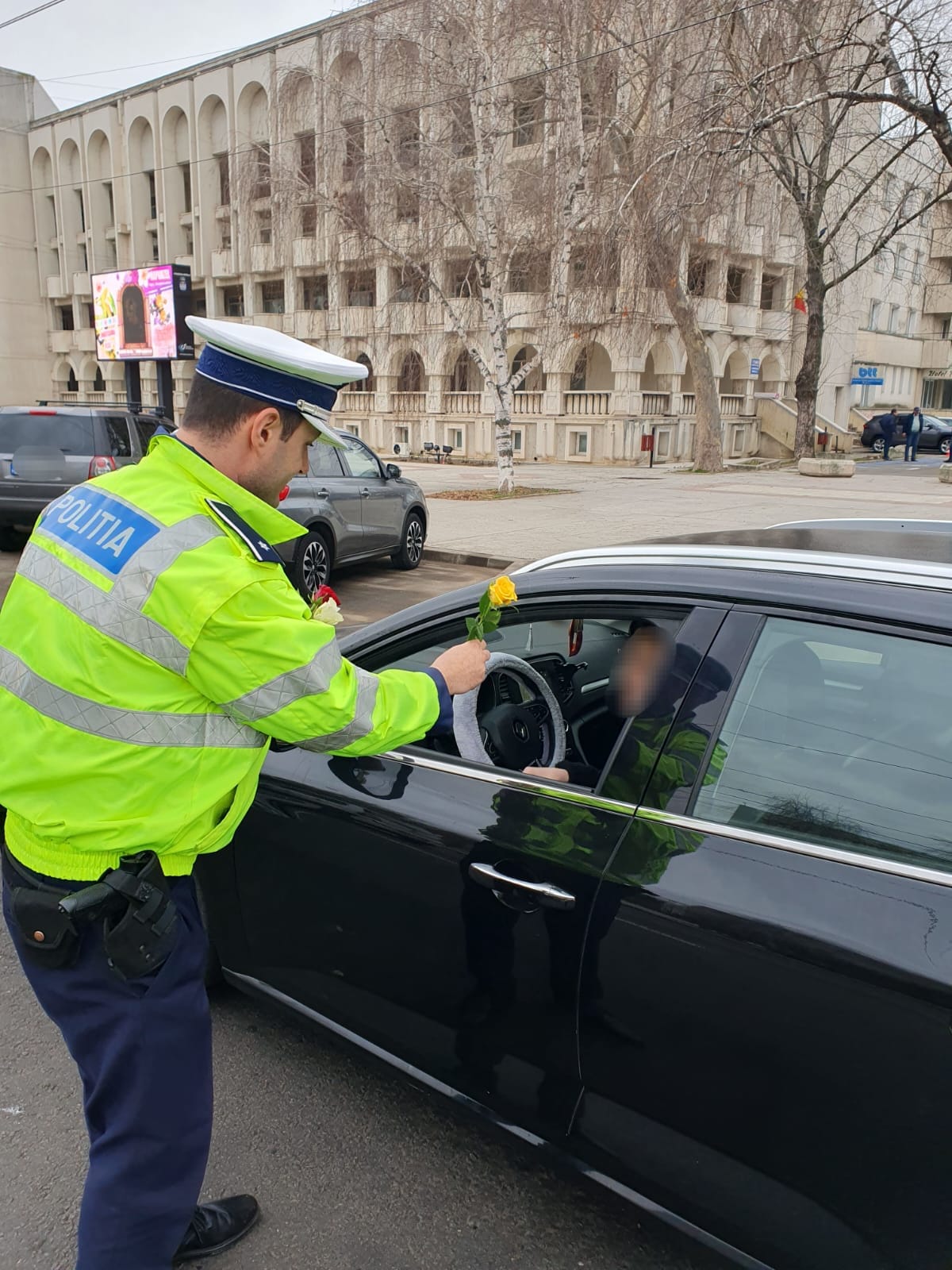 Polițiștii au profitat de ocazie și au desfășurat o activitate informativ-preventivă, pentru prevenirea accidentelor de circulație, și au oferit participantelor la trafic câte o floare.