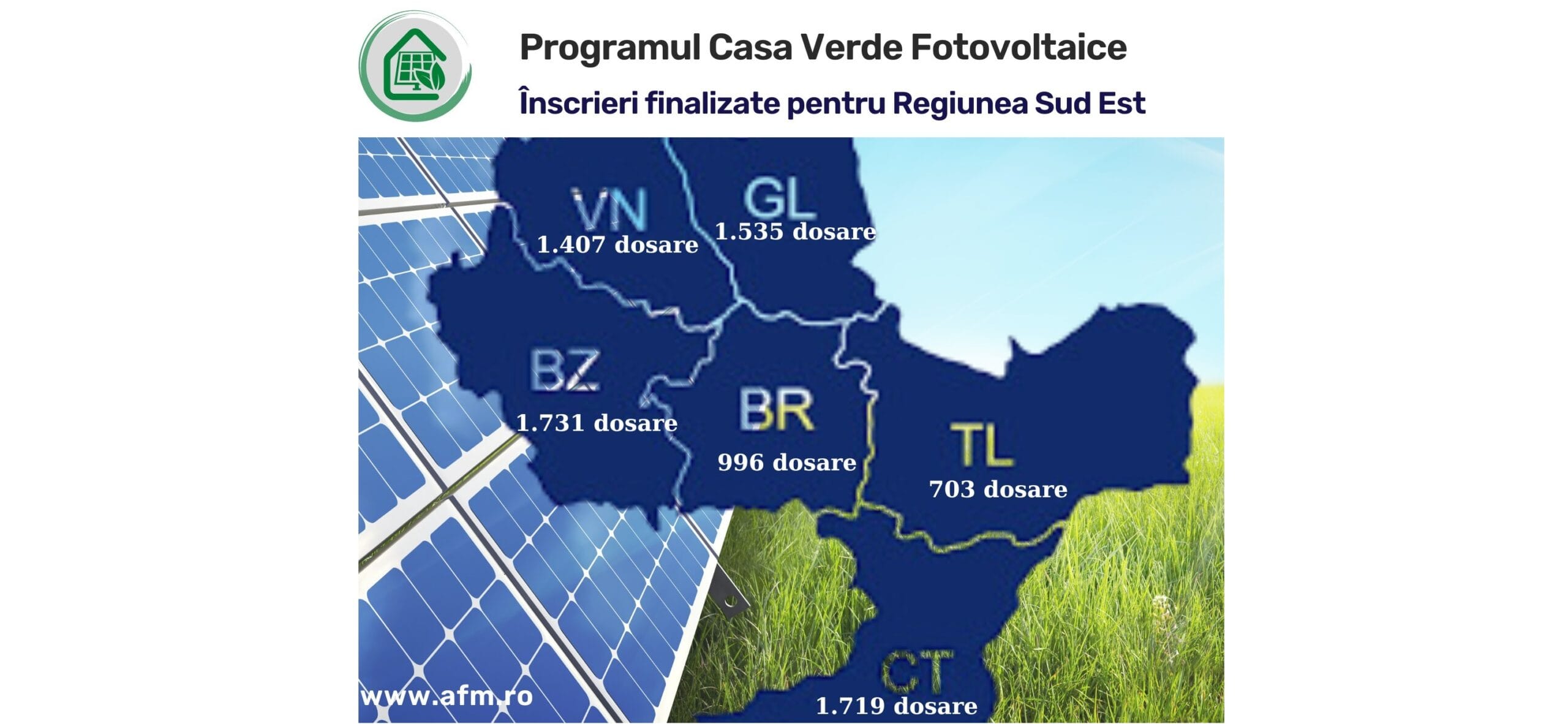 Distribuirea dosarelor depuse în cadrul Programului Casa Verde Fotovoltaice pentru Regiunea Sud – Est:: Brăila – 996 dosare, Buzău – 1731 dosare, Constanţa – 1719 dosare, Galaţi – 1535 dosare, Vrancea – 1407 dosare şi Tulcea – 703 dosare.