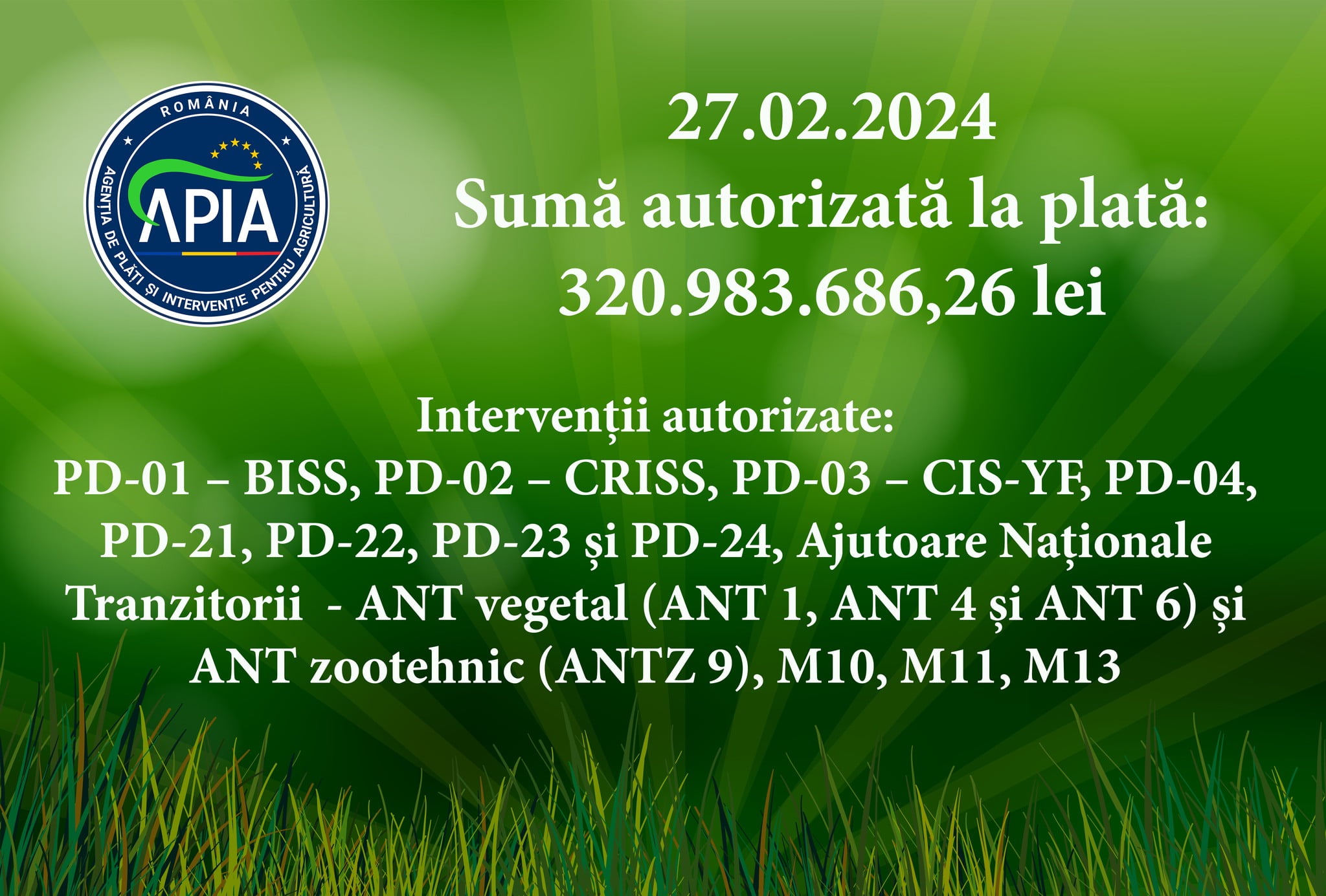Agenția de Plăți și Intervenție pentru Agricultură (APIA) informează că, ieri – 27.02.2024, a autorizat la plată 13.278 beneficiari, cu o sumă totală de 320.983.686,26 lei.